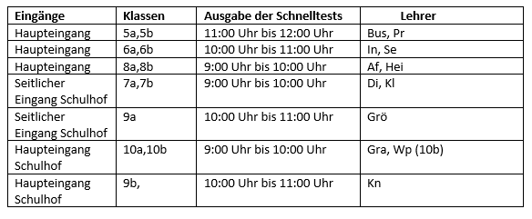 Nach den Osterferien sollen regelmäßig zweimal pro Woche Corona-Schnelltests bei allen Schüler*innen vor Schulbeginn zu Hause durchgeführt werden. Die Testkits erhalten alle Schüler*innen kostenlos von der Schule.