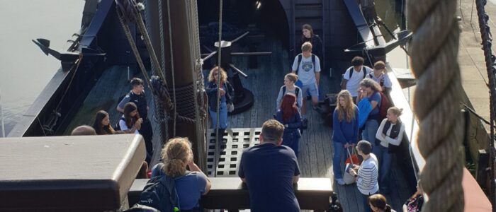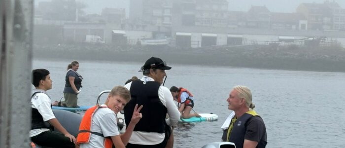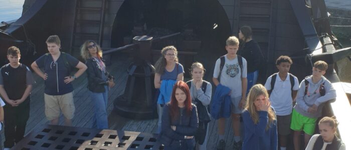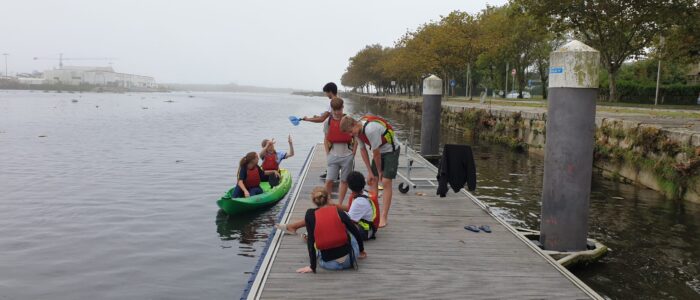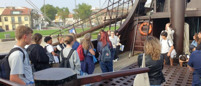 Schon allein durch die Lage des Landes am Atlantik waren die Portugiesen immer schon dem Meer verbunden und einst eine große Seefahrernation. Um den Jugendlichen einen Eindruck von dieser Verbundenheit zu vermitteln, stand der vierte Tag des Austausches ganz im Zeichen des Wassers. Dem windstillen Wetter geschuldet, wurde jedoch nicht wie geplant gesegelt, sondern auf das SUP umgestiegen, so dass die Teilnehmenden im Wechsel Solarboot und Paddelboard fahren konnten. In Gesprächen wurde deutlich, dass in Portugal bereits Grundschüler bereits ab der 3. Klasse verpflichtend schwimmen können müssen und segeln lernen. So war auch unser Lehrer sowohl Segellehrer am ortsansässigen Segelverein, als auch Lehrer an der Schule. Nachmittags ging es zu dem Kanuverein im benachbarten Dorf. Auch hier bekamen die Jugendlichen einen Eindruck von dem Wassersport. Wie die alten portugiesischen Seefahrer unterwegs waren, erfuhren die Schülerinnen und Schüler dann zum Abschluss des Tages auf dem Nachbau eines historischen Segelschiffes.