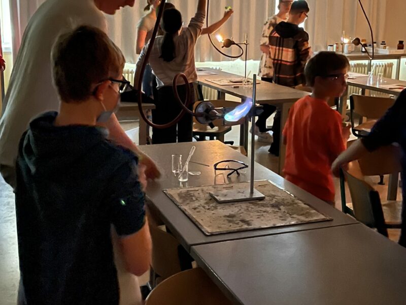 Danach ging es in zwei Rundgängen durch das Schulgebäude mit den offenen Fachräumen. Während die Eltern über die wichtigsten Formalia unserer Schule informiert wurden und auf den anschließenden „Elternrundgang“ gingen, durchliefen die Kinder ebenfalls einen Rundgang durch die Fachbereiche. Dabei präsentierten sich die Fachbereiche Chemie/Physik, Technik, Informatik, Sprachen und Musik mit einem bunten Programm zum Erkunden, Experimentieren, selber machen und Fragen stellen.