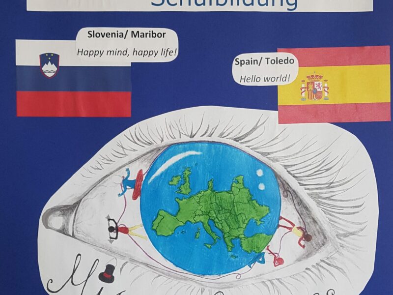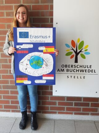 Stolz präsentiert Melissa Jenzen vom Erasmus-Club ihren Entwurf für den Logo-Wettbewerb des internationalen Schüler*innenaustausch-Programmes Erasmus+. Ihr Entwurf steht von nun an auf jedem offiziellen Schriftstück sowohl hier, als auch in den Partnerschulen in Holland, Spanien und Slowenien. „Das Logo zeigt ein Auge, eine Weltkugel mit Europa im Fokus ist die Iris. Auf der Iris stehen vier Figuren, die die vier Länder repräsentieren. Die Figuren sind in den verschiedenen Länderflaggen angemalt und posieren in den Slogans der Länder.“, beschreibt Melissa den Aufbau ihres Entwurfes. „Die verschiedenen Mottos der einzelnen Mitgliedsländer werden ebenfalls durch die Figuren dargestellt. So stemmt die deutsche Figur z. B. Gewichte, getreu dem Motto „we can“. Alle Figuren sind mit einem Schal verbunden, der das Motto des gesamten Austauschprojektes „Miracle Scarves“ symbolisiert.“