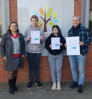 Bereits seit September 2020 nahmen Cecelia Jouma und Finn Richter aus der 9b mit großem Engagement an dem mehrteiligen Projekt Medienscouts teil, das vom Niedersächsischen Landesinstitut für schulische Qualitätsentwicklung (NLQ) und der Niedersächsischen Landesmedienanstalt (NLM) in Kooperation mit dem Niedersächsischen Kultusministerium durchgeführt wurde. Gemeinsam mit drei anderen Schulen aus dem Landkreis wurden dabei in mehreren ganztägigen Veranstaltungen Konzepte zum Umgang mit neuen Medien, zu Problemen in sozialen Netzwerken und zur Beratung von Mitschülerinnen und Mitschülern erarbeitet. Im Februar 2022 fand dabei das letzte Modul der Ausbildung statt. Nun bekamen Cecelia und Finn von Frau Dittrich und Herrn Müller, die das Projekt als Lehrkräfte begleiteten, die offizielle Teilnahmeurkunde überreicht. Auch die Oberschule am Buchwedel erhielt eine offizielle Urkunde als Ausbildungsschule für Medienscouts. Wie man auf dem Foto erkennen kann, freuten sich alle Beteiligten sehr über diese Auszeichnung!