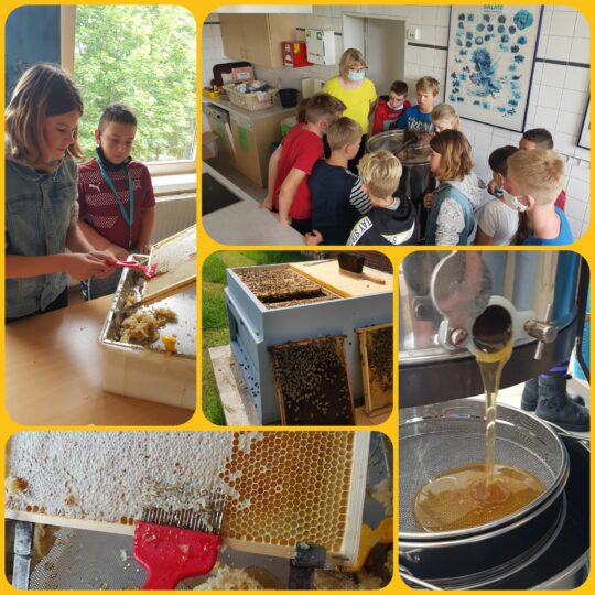 Derzeit hat die Schule 5 Bienenvölker, die von der Imker-AG unter der Leitung von Frau Steinweg und Herrn Behrens bewirtschaftet werden. Das bedeutet, dass die teilnehmenden Schüler*innen unter Anleitung und Aufsicht sowie zunehmender Selbstständigkeit alle Arbeiten an den Bienenvölkern und dem Material selber ausführen. So werden zum Frühjahr z.B. die Rähmchen vorbereitet, regelmäßige Schwarmdurchsichten durchgeführt, Ableger genommen, Königinnen markiert u.v.m. Im Sommer schleudern wir gemeinsam Honig und füllen diesen ab. Zum Winter müssen die Bienen dann gefüttert werden. Im Winter selber kümmern sich die Imker*innen der AG um das Material und führen bspw. Reparaturen durch. Zudem bauen wir stets handlungs- und produktorientiert im Technikraum nützliche Dinge rund um das Thema Bienen und Insekten. Die Pflege und Erhaltung des Bienen-Innenhofes der Schule ist ebenfalls Teil der Aufgaben.